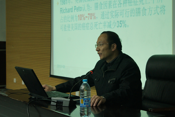 讲座开始,杨维平老师列举了2005年全世界死于癌症的人数,据统计,在全世界死于癌症的人数中,有70%发生在发展中国家。癌症中有20%的由慢性病引起,这些病如果早发现,早治疗,有三分之一的是可以治愈的。杨老师对癌症的可能病因,饮食致癌,饮食抗癌,营养成分与癌症,食物与癌症,饮酒与癌症等方面进行了解说。其中,杨老师尤其以饮食致病为例,从致病背景,癌变机理,食物中公认的致癌物等几方面做了详细介绍。并叮嘱大家在生活中一定要注意饮食习惯,不能偏食但也不能随心所欲的饮食,要合理、科学的饮食。对饮食的几点建议是同学们最关注的一点,杨老师指出,多吃如玉米、红薯、南瓜、大蒜、茄子、苦瓜等有天然的抗癌作用食物,多吃蔬菜、水果和纤维含量高的食物,注意饮食的多样化,不吸烟,限制酒精的摄取。在讲座的最后,杨老师指出,饮食只是导致病变甚至发展到癌症的诸多原因之一,因为诸如遗传、病毒、吸烟、环境因素等都可导致病变甚至癌变,需要大家在日常的生活中多多了解,远离发病源头,做到早防早治。