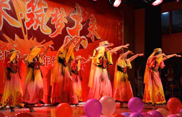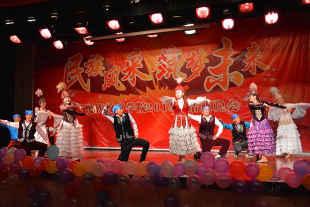 晚会正式开始前,首先进行了颁奖仪式,重点表彰了对在2014—2015学年度中表现突出的优秀学生、优秀学生干部,以及在民族团结活动月中表现优异的学生和集体。院长冯建新和党总支副书记窦文阳宣读获奖名单,学工部副部长芮国星、党总支书记郑生忠上台为获奖学生颁奖并合影留念。接下来,在一曲哈萨克传统舞蹈《恰熟》中,晚会正式开始。歌舞《中国我为你歌唱》、合唱《爱我中华》表现了当代青年学子朝气蓬勃、积极进取、昂扬向上的新形象;预科同学带来的舞蹈《吉祥谣》、《萨吾尔登》、《刀郎舞》、《梦幻花园》、《赛马舞》、《异域风情》展示了omofun