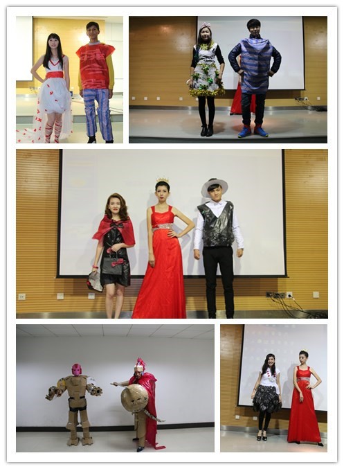预科九个班级的同学们组成的废品时装表演正式开始。同学们发挥自己的想象力和创造力,将生活中的废旧物品如垃圾袋、纸箱子、蚊帐、横幅等变废为宝,制作出了一件件有创意的服装,在充分展现omofun