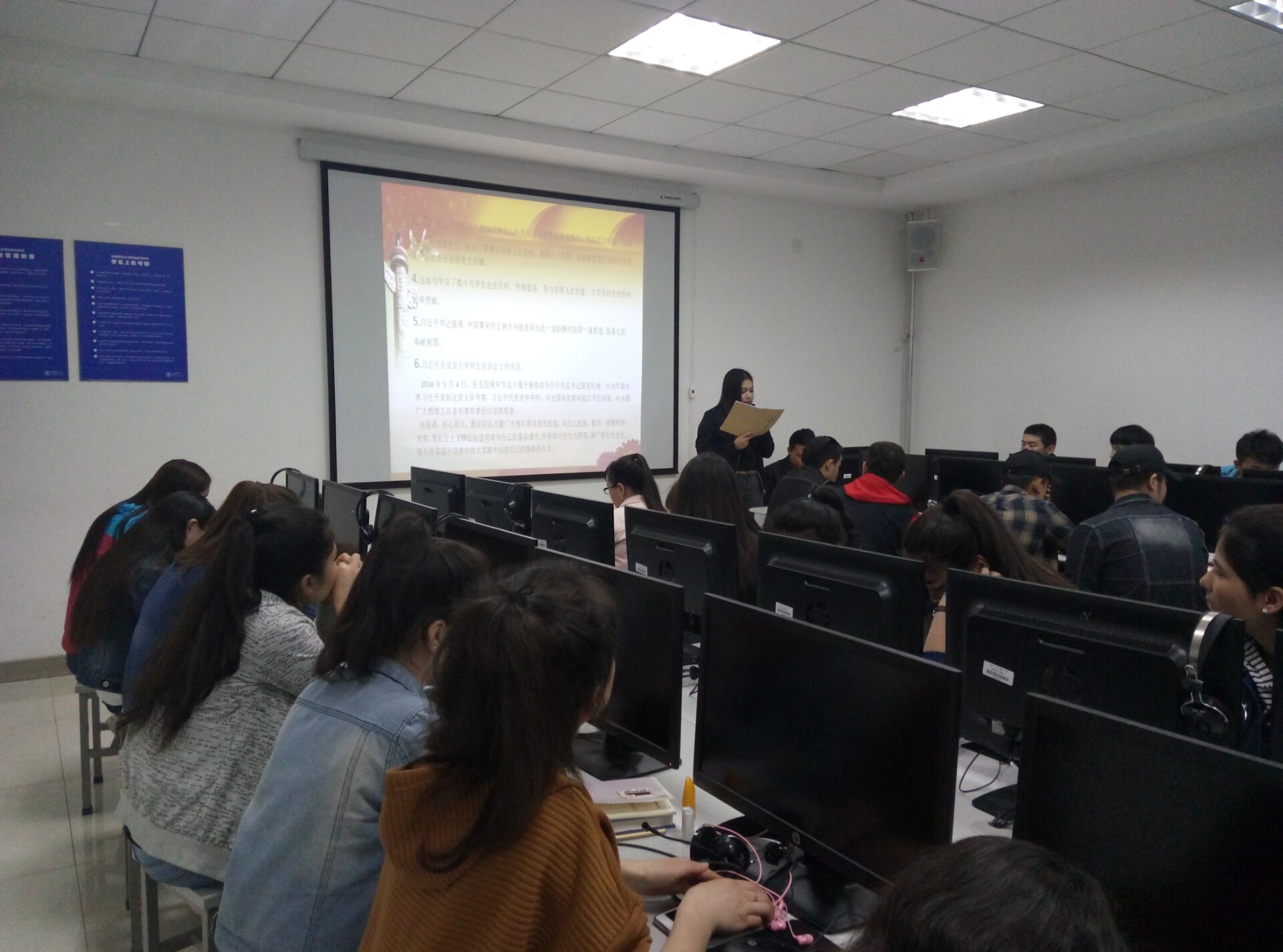 预科7班学生在9705教室开展了“志存高远、脚踏实地,弘扬五四精神、放飞青春梦想”为主题团日学习活动。活动有吐力发尔主持,预科七班全体学生参加学习讨论。此次学习以五四精神为核心,紧密联系当今时事政治,通过对习近平总书记在青年代表座谈会上重要讲话内容的深入学习,预科七班团支部的全体成员能够及时准确的跟随团的步伐前进,提高政治思想觉悟,增强历史使命感,树立远大的目标。