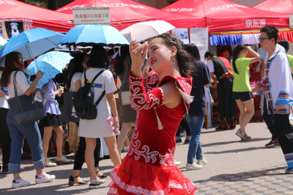 开幕式上,各位领导嘉宾与少数民同学优秀代表互赠礼物。老师用《青年们,读马克思吧!》等书籍勉励同学们努力学习,用实际行动回报伟大的祖国;同学们用一条哈达、一顶花帽表达对老师教育之恩的感激。之后,全体师生一起欣赏了民族大联欢舞蹈《母亲是中华》,并参观了各民族学生展示的极具特色的民族工艺品、服饰、乐器、特色小吃,各位领导嘉宾不时驻足,饶有兴趣的拍照留念。