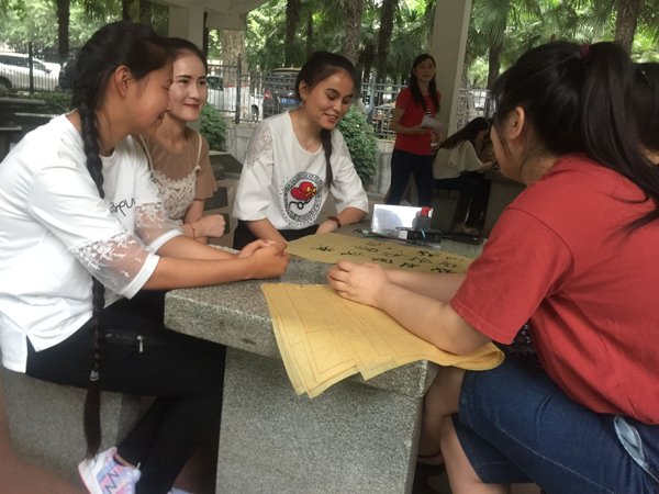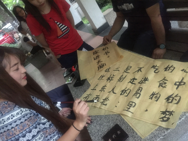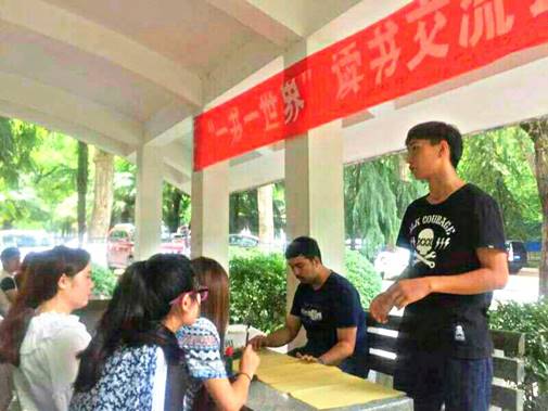 本期“一书一世界,墨香满长安”读书交流会以户外交流的方式来进行。第一环节中大家畅所欲言,读书爱好者们分享各自的读书方法,相互介绍已阅读书籍,同时各小组代表上台向大家分享了自己小组读书经验。随后在第二环节中,每组在五分钟之内提笔写出了对于人生、梦想以及书籍的感悟。大家拿起项目组准备好的毛笔在纸上写出了自己对人生的感悟,对未来的憧憬,在每组写完之后,评委按照字体的整齐性和内容的积极性等方面做出评分。最后,主持人对这次活动做出了总结,活动负责人给每个小组颁发了奖励品。