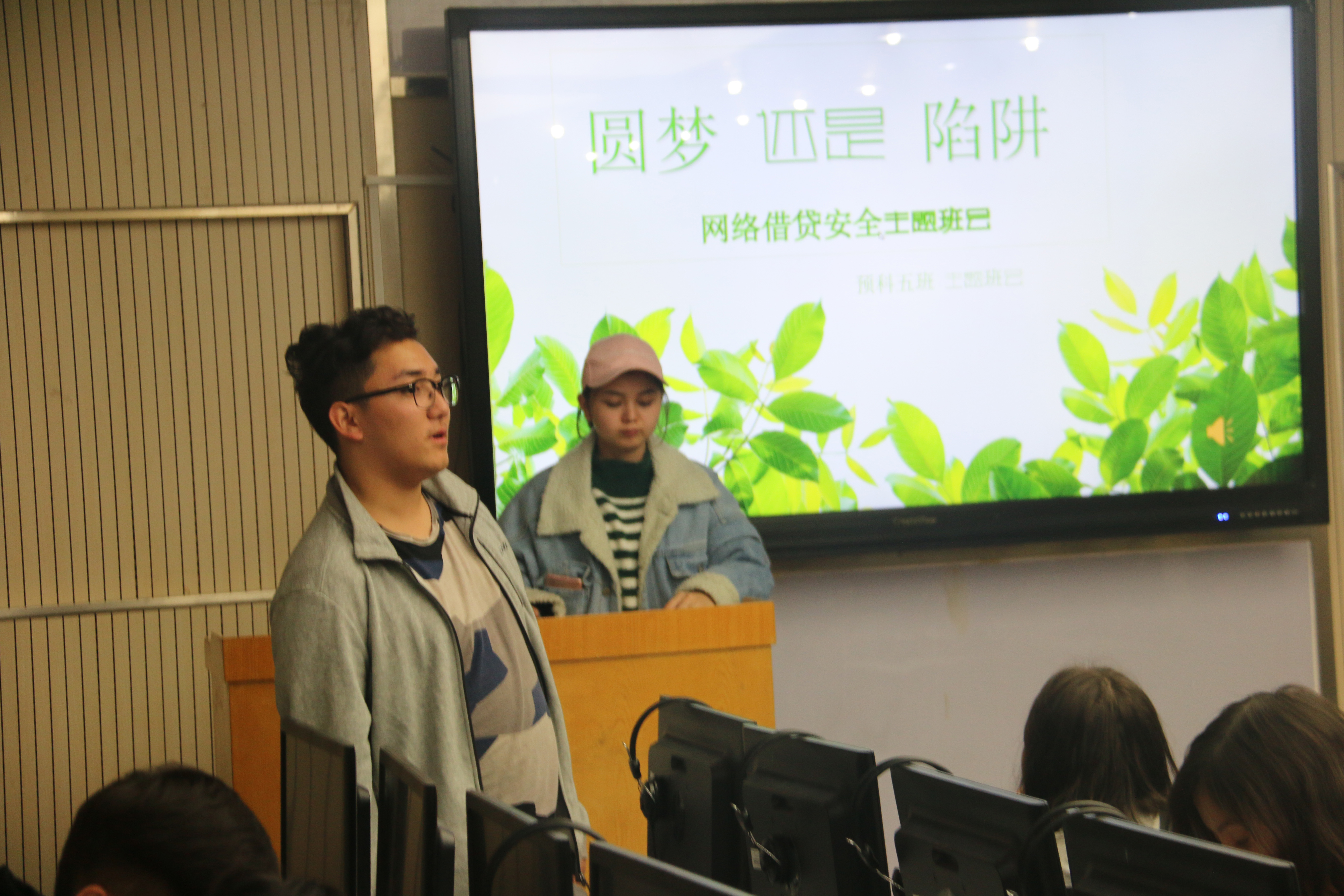 专职辅导员热依木老师除了列举我校和其他高校发生的一些典型案例之外,还给学生讲解了一些不良校园网络借贷流程,通过这些讲解将不良校园网络借贷的诈骗性实质揭露。热依木老师强调大学生年轻意充满了激情,但任性的青春也要警惕风险。大学生们经济不独立、财务不自由是客观存在的,学校和家长理应在思想引导、理财观念的培养、风险教育上下功夫。理性消费不能在大学教育中缺席。最后同学们认为大学生须树立金融安全意识,警惕高息贷款;消费要树立“理智先行、量力而行”的准则。(附图9、10、11)