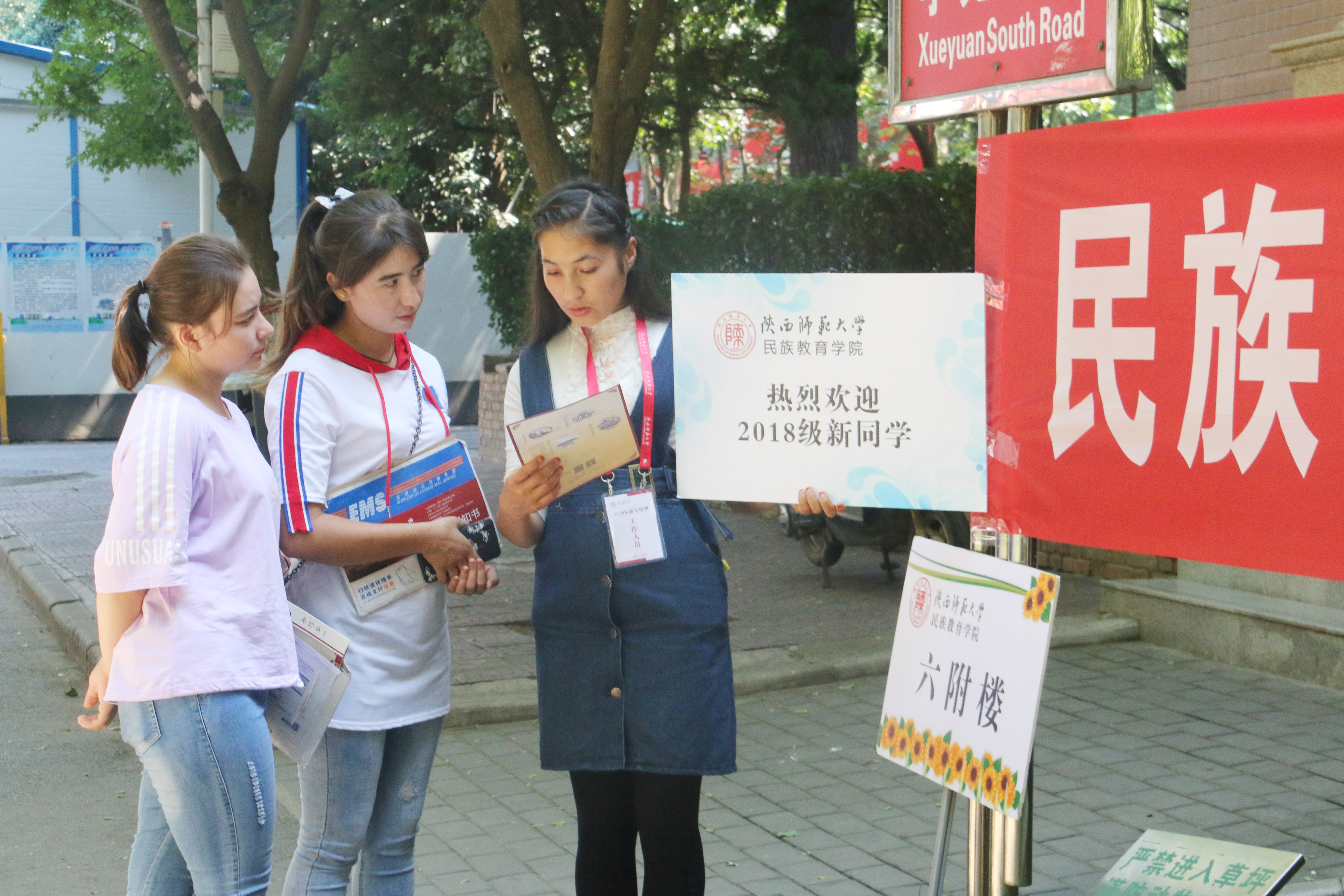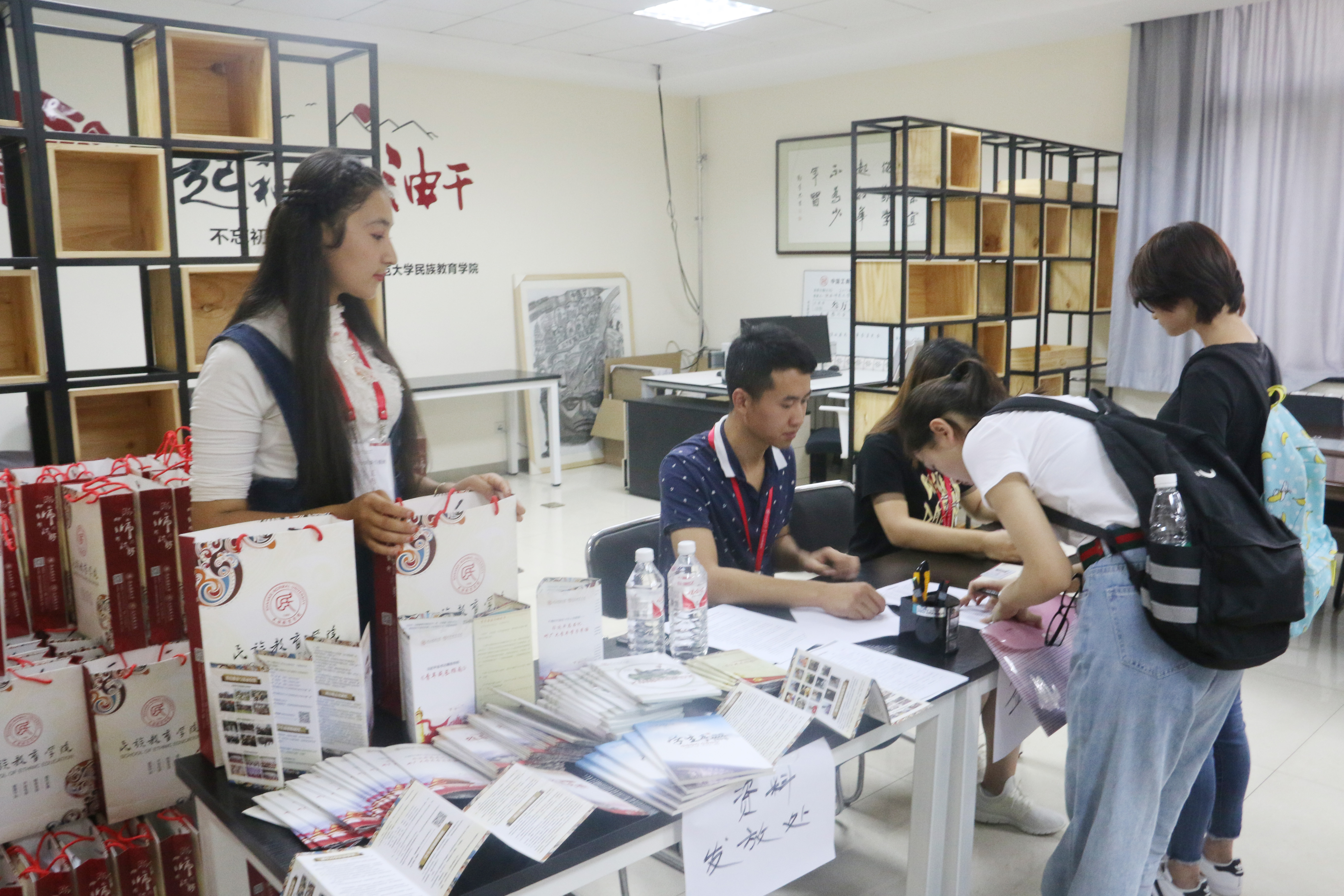在几天前就开始着手布置场地,早早为新生们拉起的欢迎条幅、报道厅中展示的各民族工艺品还有校园多处设置了咨询处等……这些不仅体现了民教院浓浓的民族风情,也显示了民教院团结友爱,互帮互助的大家庭氛围。