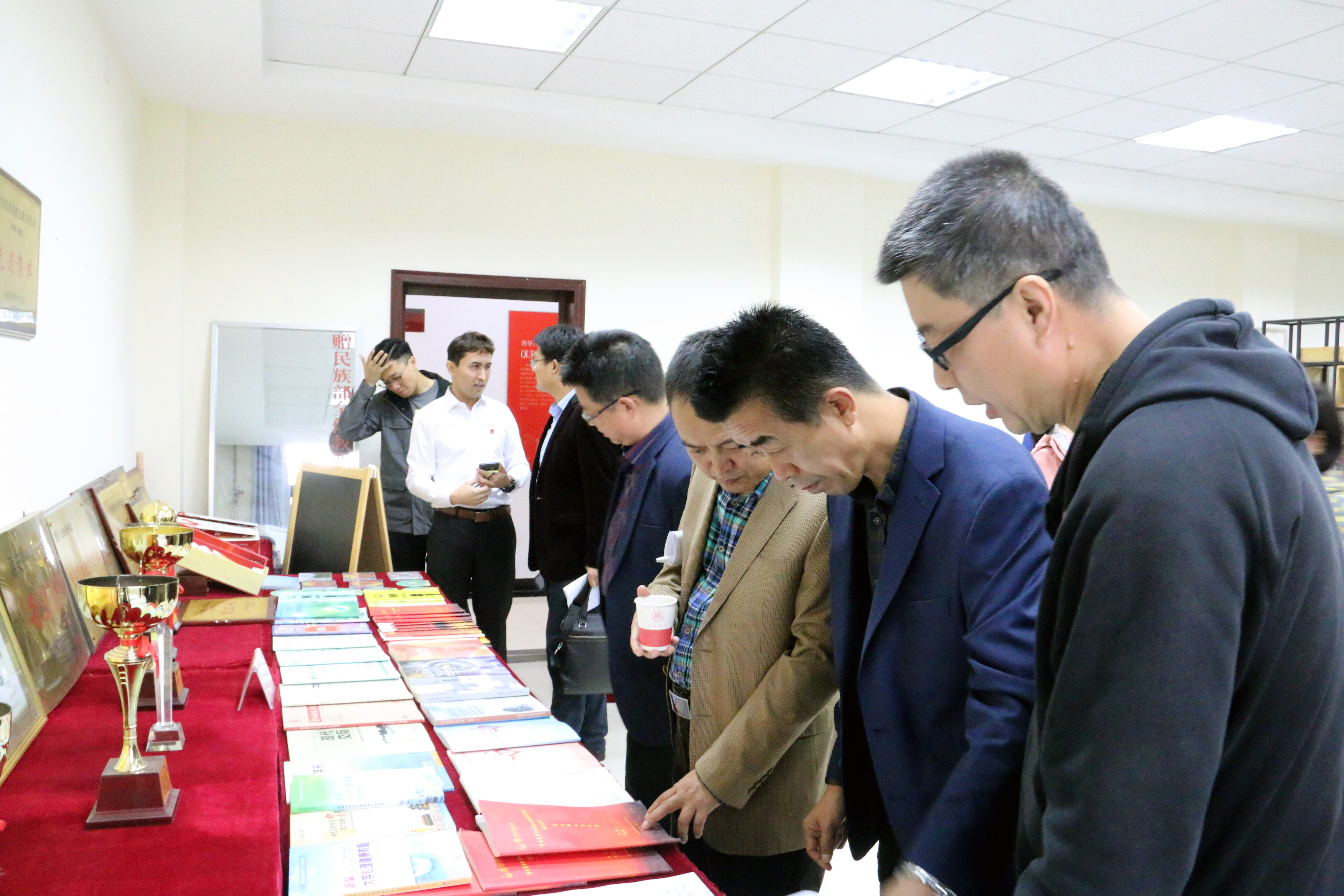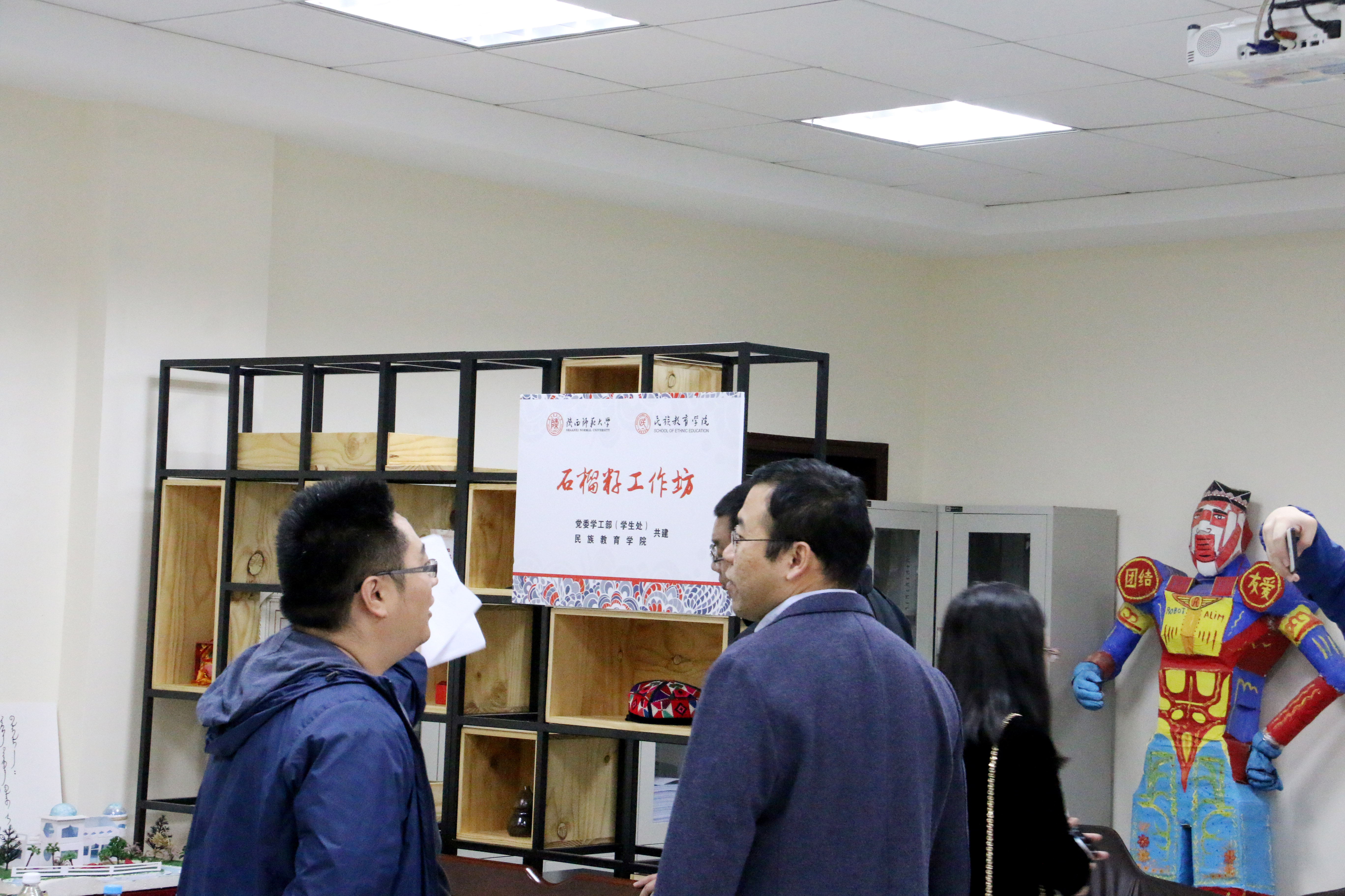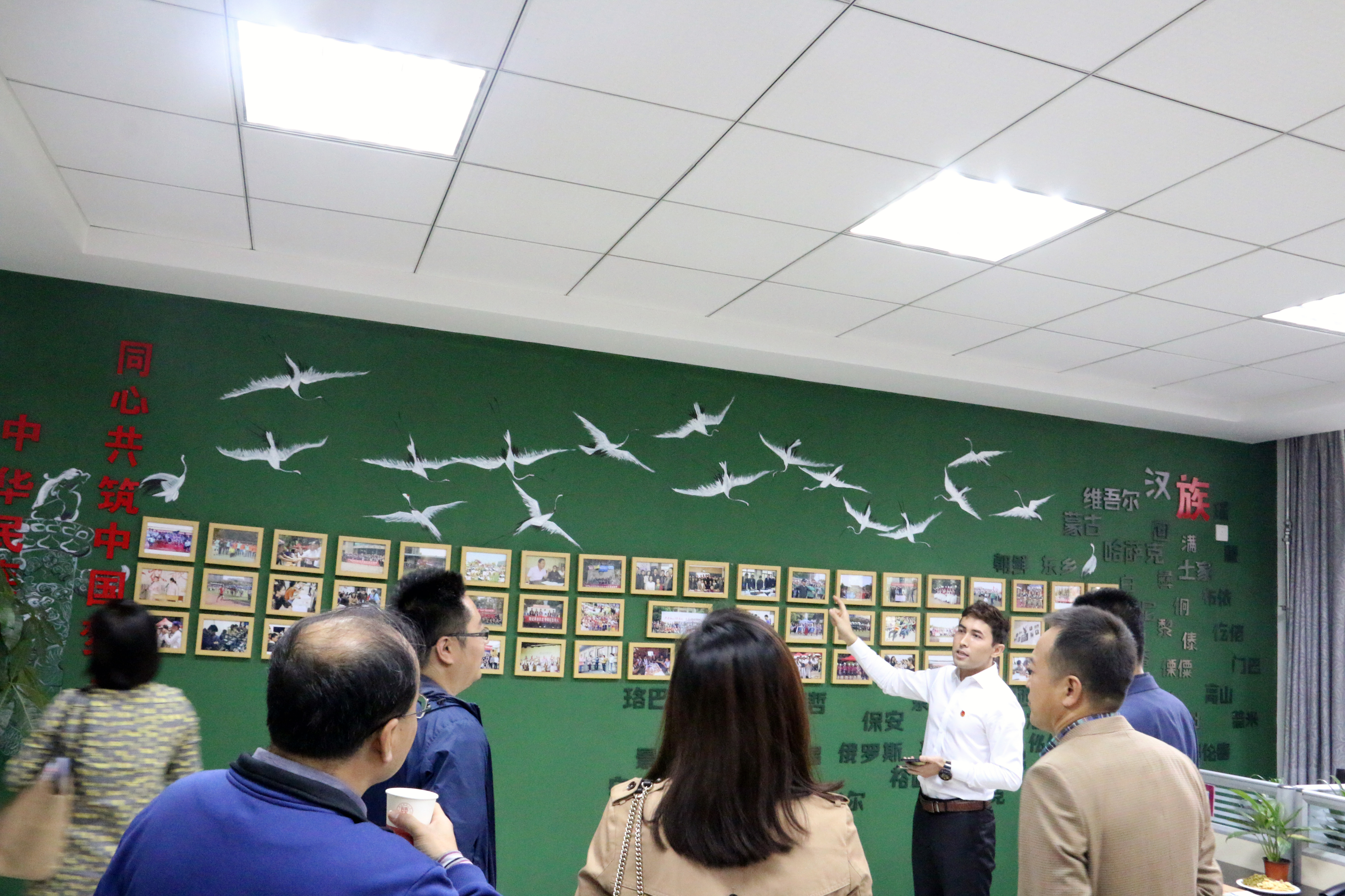 辅导员热依木引导大家参观了学院学工队伍办公室、学院“悦心坊”二级心理辅导站、石榴籽工作坊、民族教育成果陈列室、少数民族大学生马列理论学习中心、党团学生活动室等活动场地,并向大家介绍了以“同心共筑中国梦,中华民族一家亲”为主题的手绘文化墙,并对特色内容展示做了寓意介绍,同时也对文件柜中150余学生工作材料和学生管理制度档案盒做了简单介绍,展示了omofun