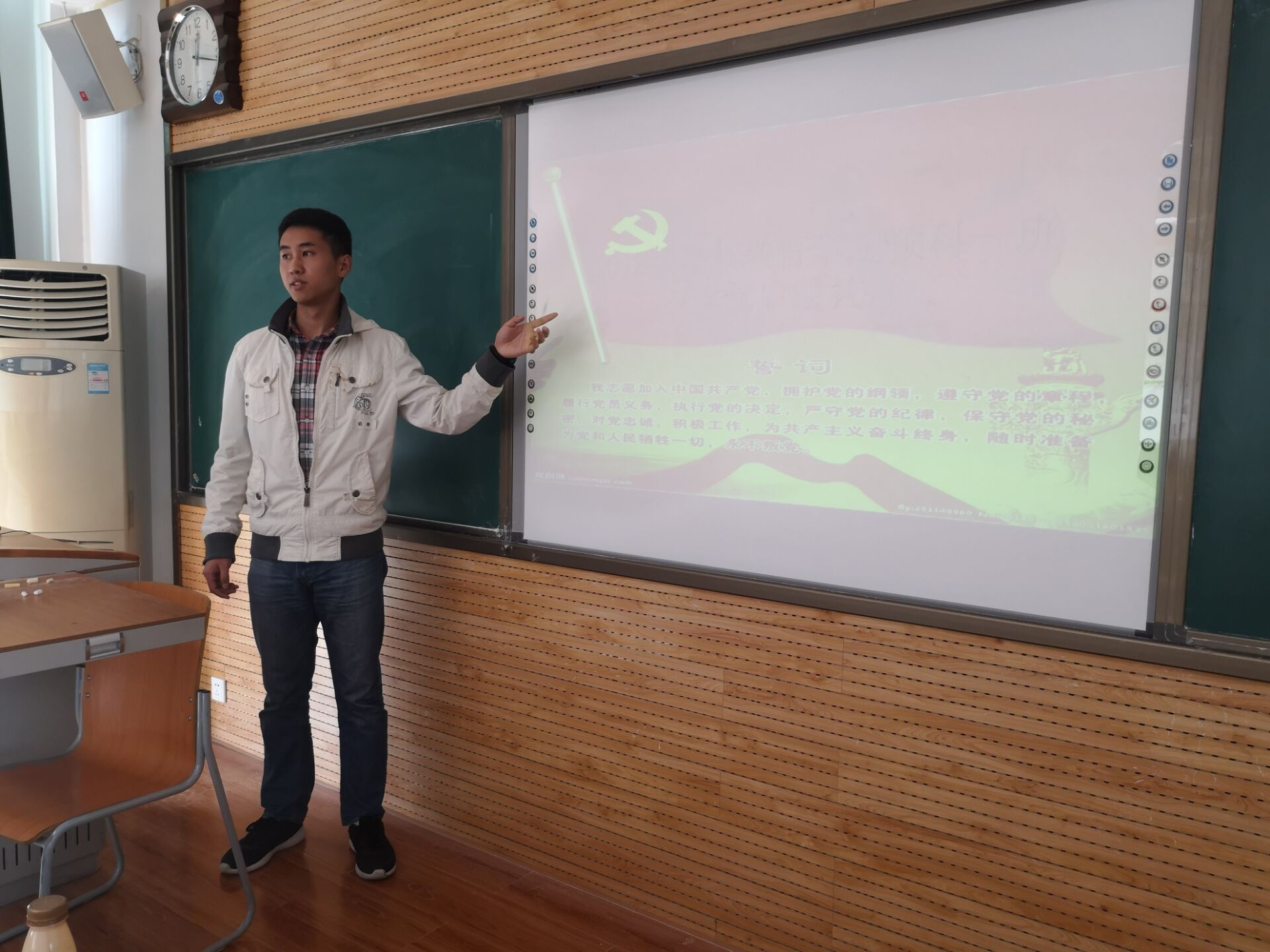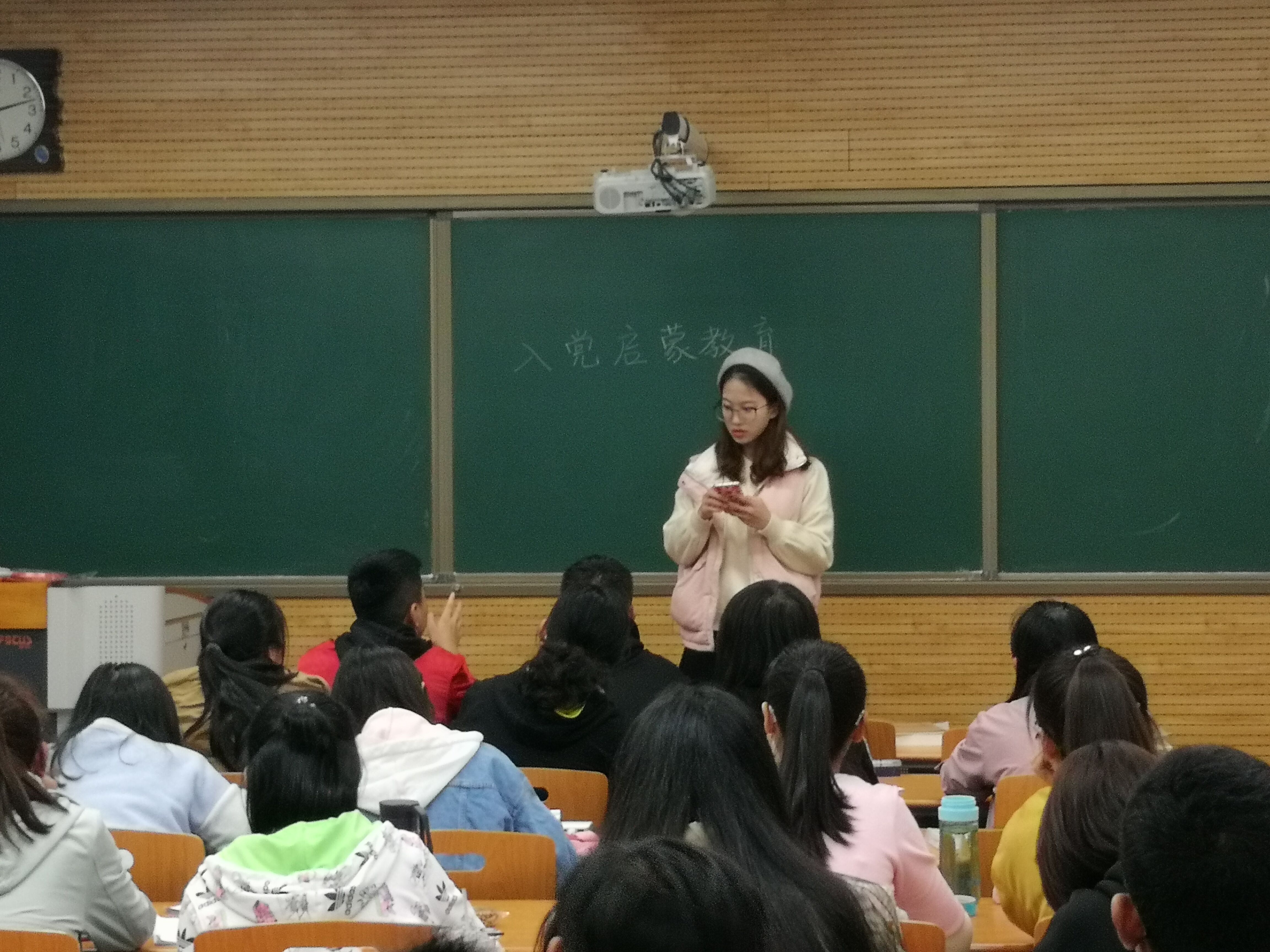 在班会上,各班团支书对近期组织班级所观看的红色影视做了简短的观后感汇报,汇报中,同学们都深深地感受到了我党历史上的艰辛并对如今我党新时代下的成绩感到骄傲和自豪。然后各班专兼职辅导员老师围绕党的十九大报告精神与新党章内容做了简单的介绍和教育。随后,针对为什么要加入中国共产党?怎么加入中国共产党?以及加入中国共产党的要求三个方面向学生做出了详细的阐述,具体向大家介绍了中国共产党的历史、性质、宗旨、最高理想等。使学生更加深入地了解了中国共产党。让同学们受到了思想上的洗礼,明白党组织是一个先进的集体,坚定了同学们的入党信念。老师们还对入党的流程给学生作出了简要阐述,对学生所提出的入党能不能挂科,如何撰写入党申请书等相关问题做出了简要回答。使学生对于入党的流程以及规范有了更加清晰的认识。最后,各班辅导员老师在学生中出现的主要问题上做了正确的引领和教育,向大家提出了一定要端正自己入党动机的要求,并结合历届入党积极分子为例,鼓励大家提高自己的思想意识,积极参与到入党的筹备工作当中去。