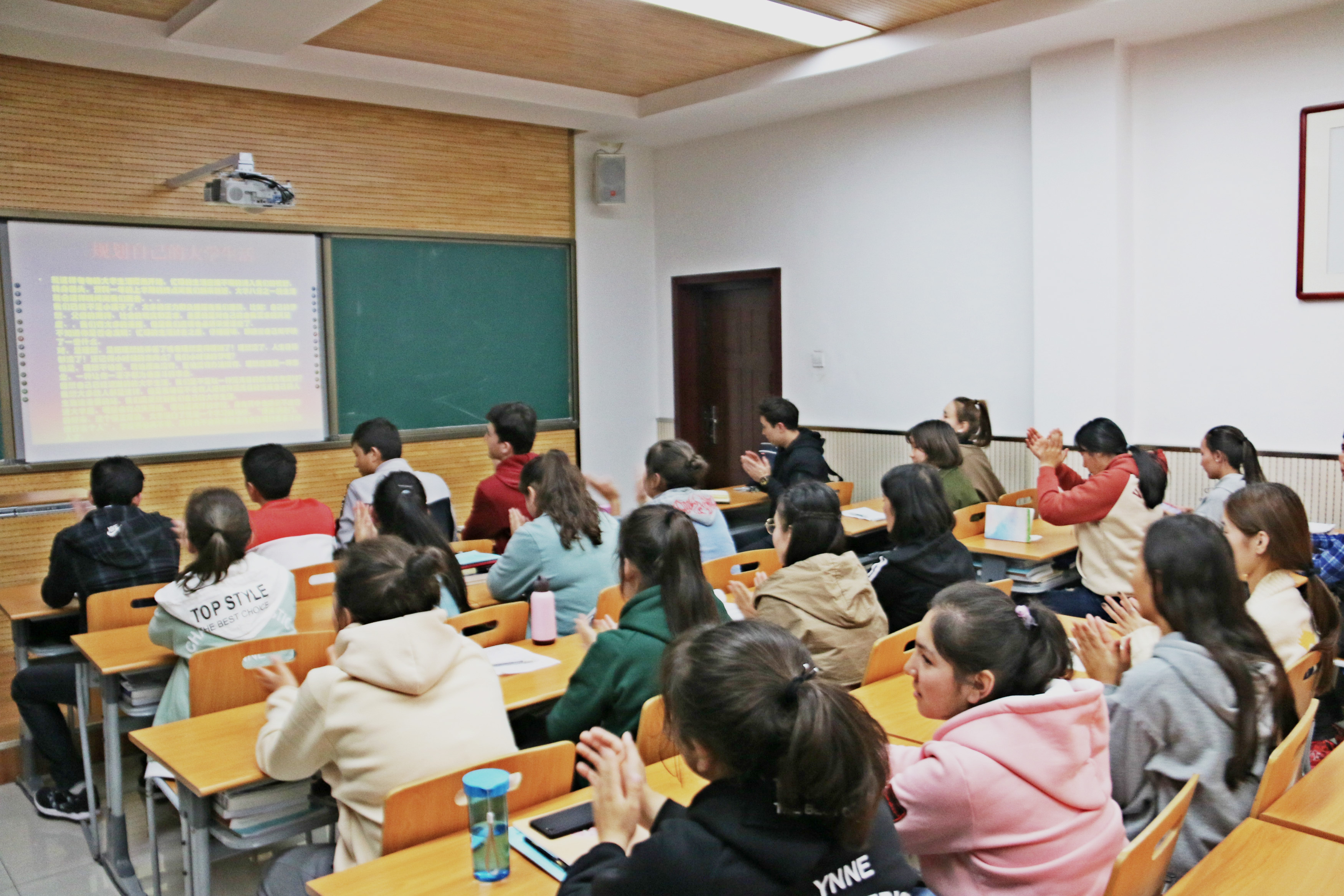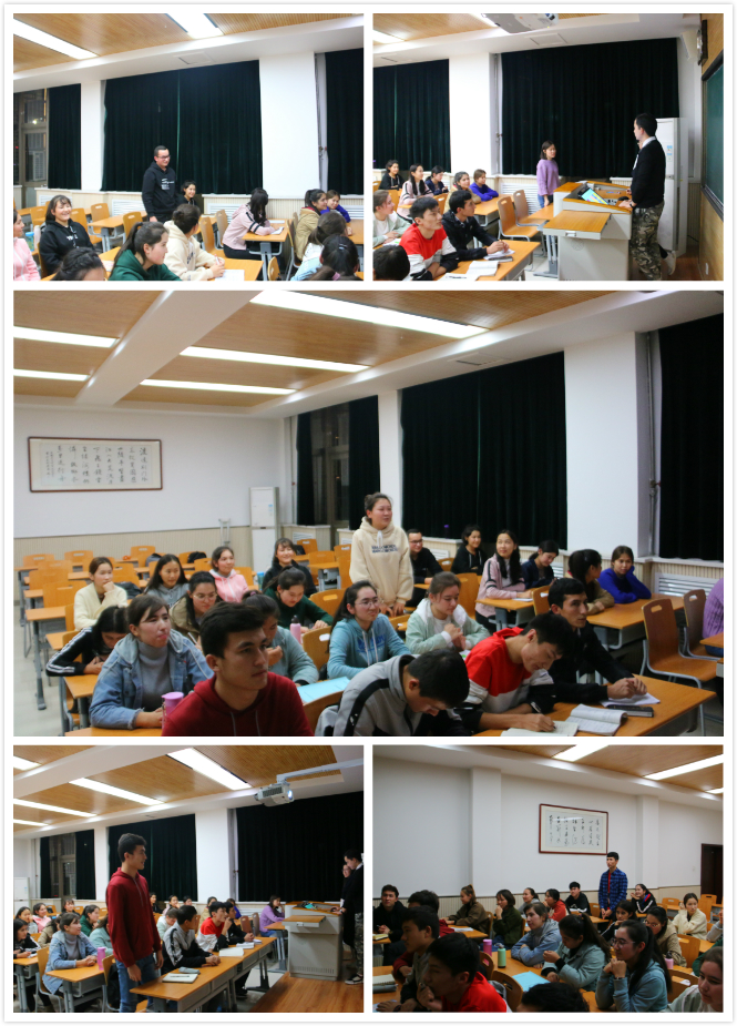 班会最后,辅导员热依木老师做了总结。首先,他从学习、生活环境、人际关系及心理健康等四个方面的适应性教育做了简单综述,并针对同学们在班会上所提到的困惑和问题进行了分析,分享和提出了个人当时如何适应大学生活的经验和几个建议;他强调,只有好的开始、好的习惯的养成,才能为取得成功创造先决条件。最后,热依木老师希望同学们在校期间打好扎实的语言基础,提高计算机应用水平,培养独立思考和创新能力,读好书,以“用心开启智慧,用行实现梦想”为结语,鼓励同学们不断进取,继续攀高。