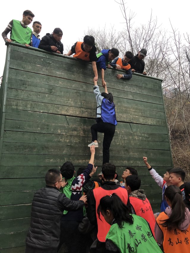 下午4点半,同学们来到了最后一个项目“绝壁求生”场地。在教练员指导及四位队长商议后,整个团队进行了分工。短短18分55秒里,大家通力合作,团结协作,成功完成了任务。俗话说:人心齐,泰山移。同学们的成功离不开所有默默奉献和付出的同学为大家提供的坚实基础,也离不开每一位成员的积极配合。
