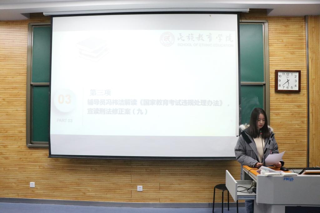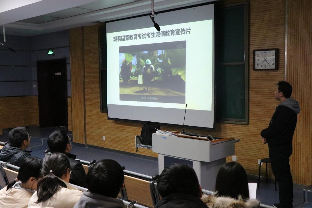 大会伊始,同学们观看了《国家教育考试考生诚信教育宣传片》,引起大家对诚信考试的重视。接着,兼职辅导员许珊带领学生重新学习了《学生手册》中关于“学籍管理实施细则”和“学生考试违纪、作弊处理办法”相关规定,向同学们详细介绍了什么是违纪、什么是作弊以及违纪作弊的相关处理和对个人未来发展的影响。兼职辅导员冯祎洁宣读了《国家教育考试违规处理办法》,倡导同学们遵守纪律,诚信应考。