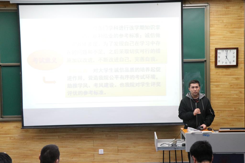 团总支书记赵超类举了以往我校和学院考试中出现的考试作弊典型事件和受到处分的案例,对诚信考试做了详细说明,希望同学们引以为戒,积极备考,诚信应考。