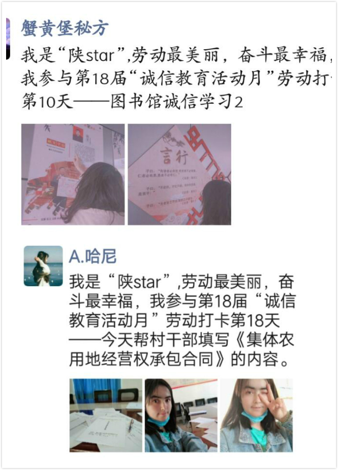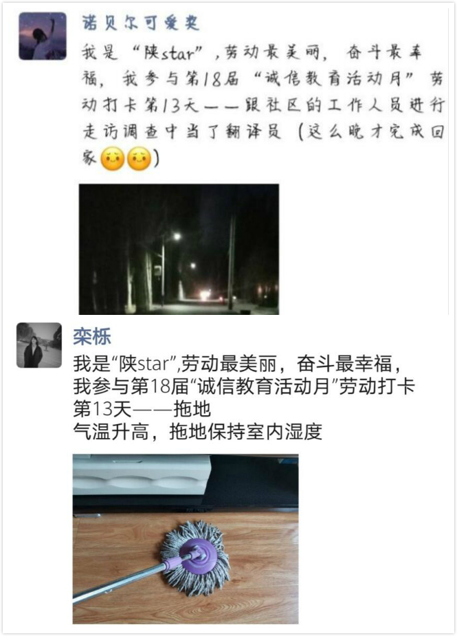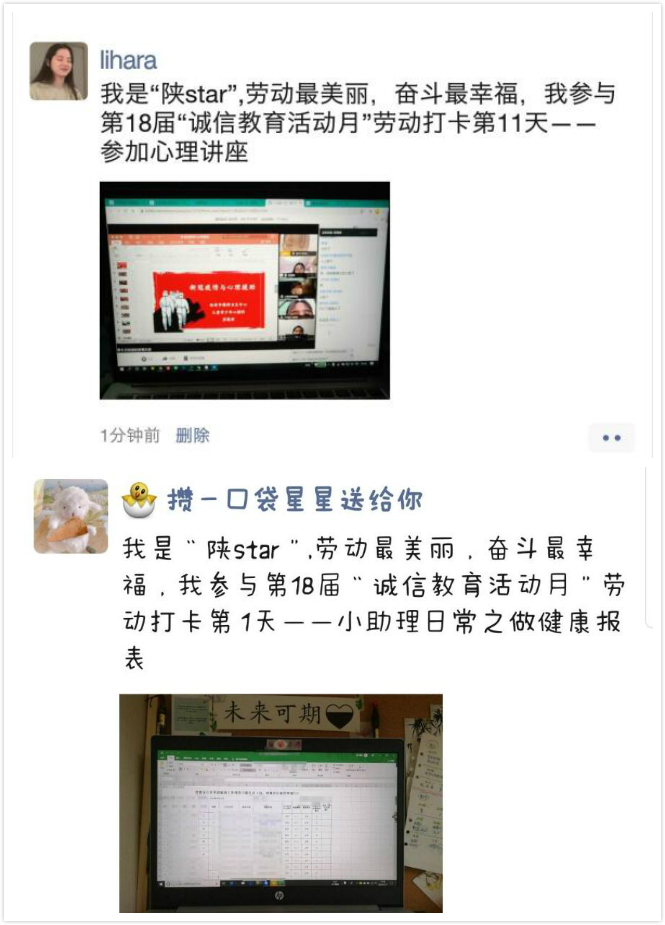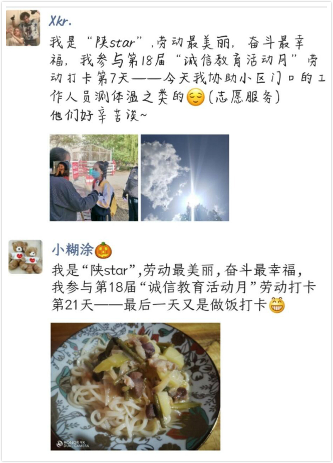 5、线上打开夯实教育效果。为加强疫情期间学生居家劳动教育,将诚信教育与劳动教育有效结合,学院丰富主题教育活动形式,开展“21天”诚信劳动打卡活动。鼓励学生将连续21天参与劳动的画面进行线上平台展示,分享劳动心得体会,较好地提升了学生门热爱劳动、诚实守信的思想意识。omofun