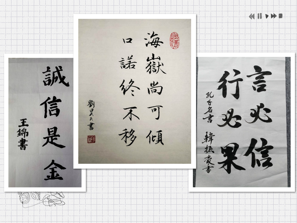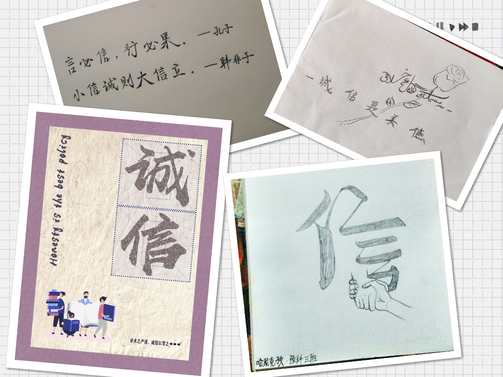 3、主题作品深入活动过程。为调动学生积极性,丰富青年学生群体的想象力、创造力,引导学生传播守信正能量。学院同步开展书法、绘画、海报、篆刻、剪纸、漫画等诚信主题作品创作活动,活动一经发布,得到了全院预科学生的积极响应,参与气氛浓厚,佳作频出,引人共鸣,活动中我们共收到了20名学生的创新作品。