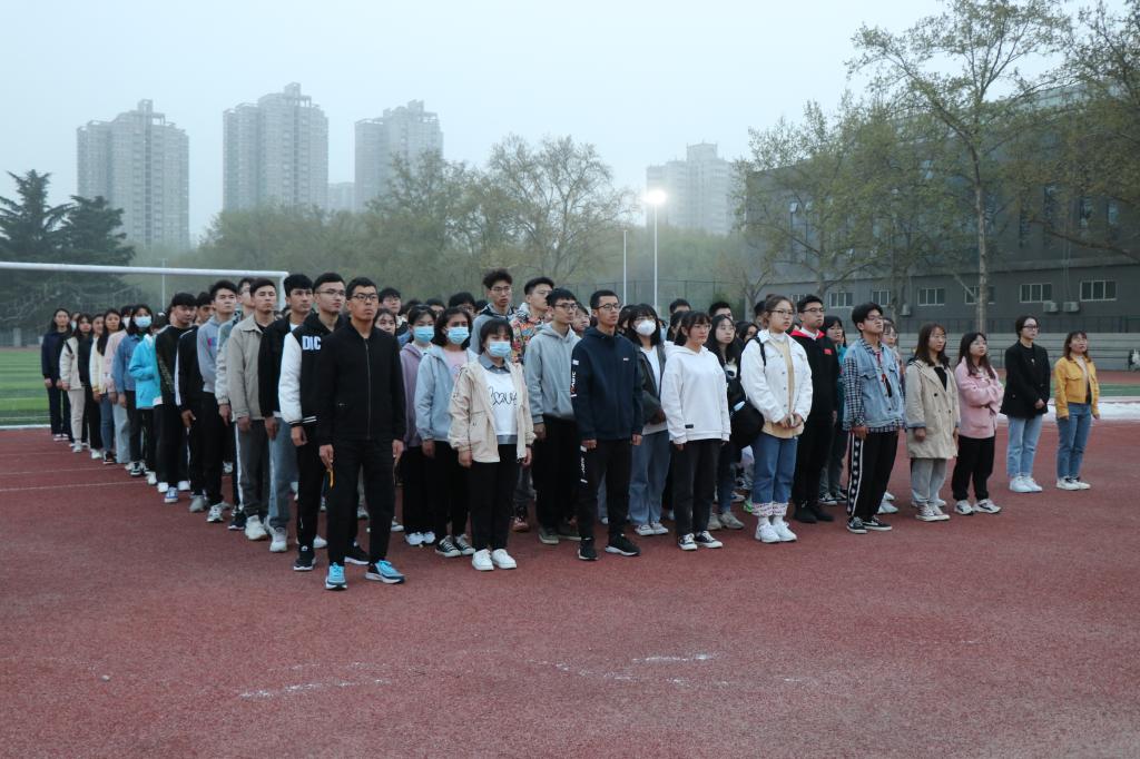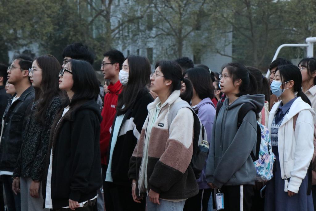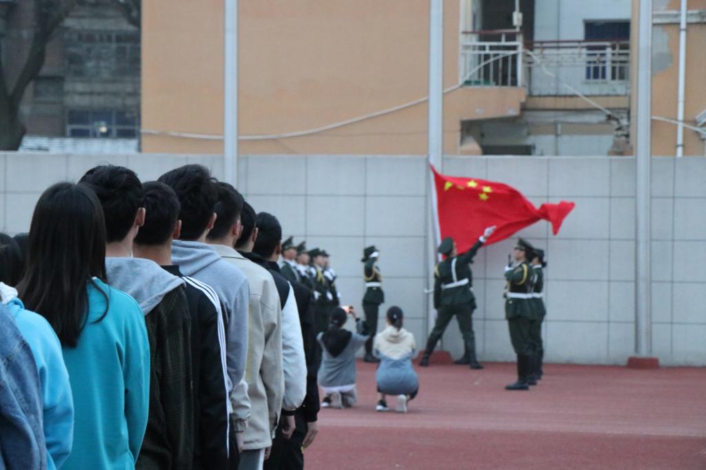 师生庄严肃立,升旗手、护旗手肩擎国旗,迈着矫健的步伐,护送国旗来到国旗台,挥洒国旗、行举手礼。在雄壮的国歌声中,鲜艳的五星红旗冉冉升起、高高飘扬,师生用注目礼向国旗承诺:为了不辜负党和人民期望,全体学生要刻苦学习,投身社会,为建设社会主义现代化强国而努力奋斗。