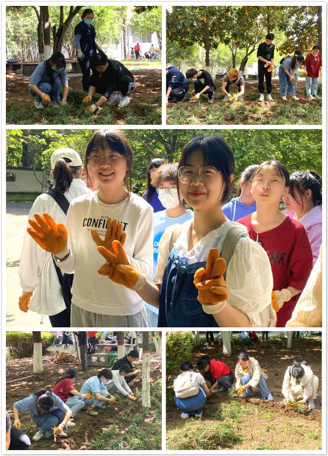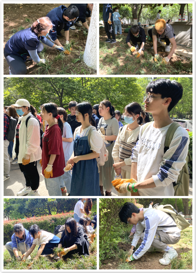 专职辅导员热依木带领学院30余名学生在雁塔校区8、9号教学楼门前草坪开展锄地种草户外劳动教育实践活动。