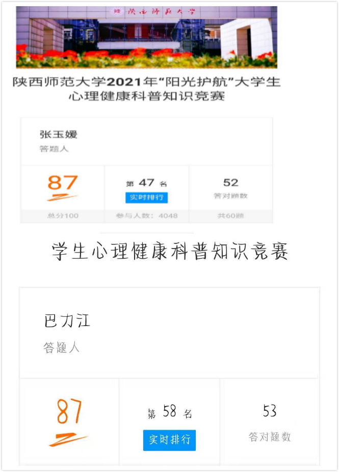 全体学生于4月参加心理健康科普知识竞赛。本次竞赛目的在于在大学生中宣传和普及心理健康科学知识,帮助其正确自我认知和学会心理调节,掌握积极应对压力和挫折的心理方法与技术,树立自尊自信、理性平和、积极向上的良好心态。这次的竞赛在线上开展,同学们积极地参与,诚实守信,增加了有关心理方面的知识,拓展了相关认识。纷纷表示收获颇丰。
