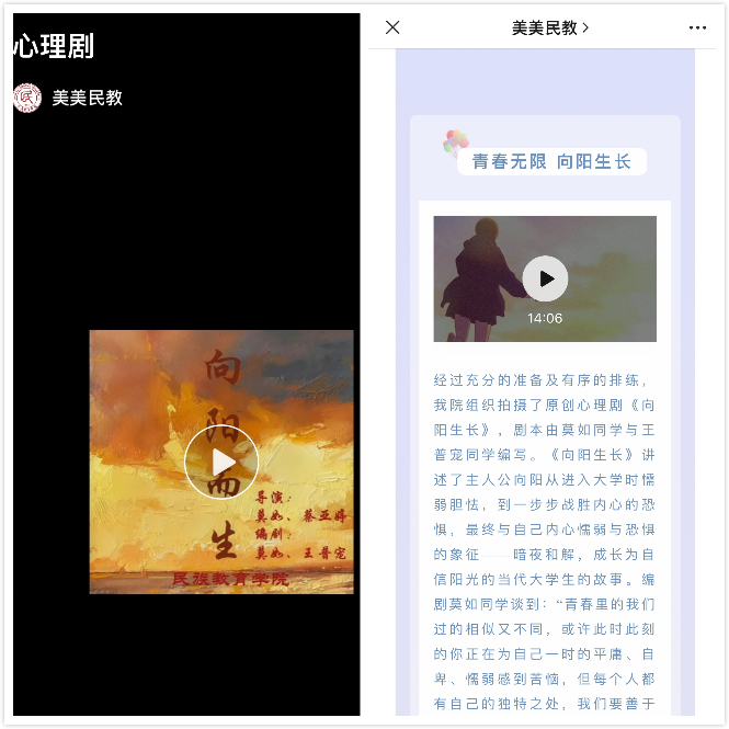 学生于5月原创编剧排演拍摄心理情景剧《向阳而生》,该剧主要讲述主人公向阳从进入大学时懦弱胆怯,到一步步战胜内心懦弱与恐惧,战胜心魔,成长为自信阳光的当代优秀大学生的故事。该剧在学院公众号发布后广受老师和同学好评,并将在学院年度综合表彰大会上放映。