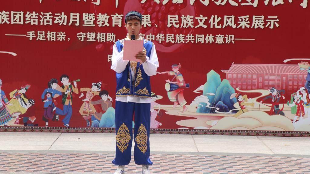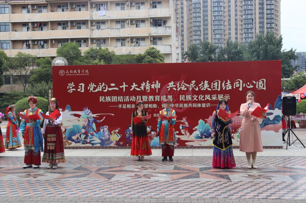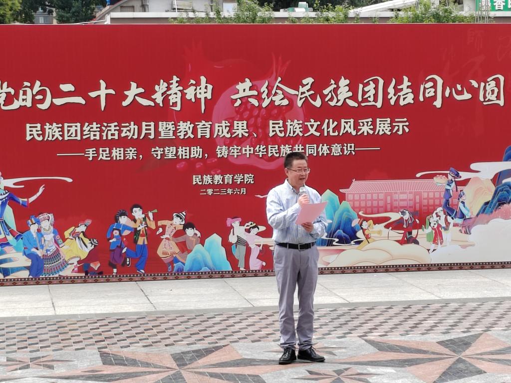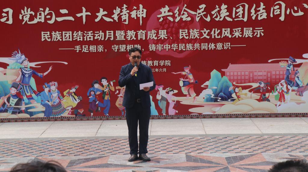 的一项传统特色活动,也是学院深入推进民族团结进步创建工作的一项重要举措。民族团结活动月的开展为广大学生展示自我、表达自我提供了舞台;也为促进全校各民族师生深入了解、深入交往搭建了桥梁。他寄语同学们,要充分认识本次活动的重要意义,在展示中促交流、在交流中促融通、在融通中促团结,深刻理解党的二十大精神重要内涵,铸牢中华民族共同体意识,真正做到共绘民族团结同心圆!
