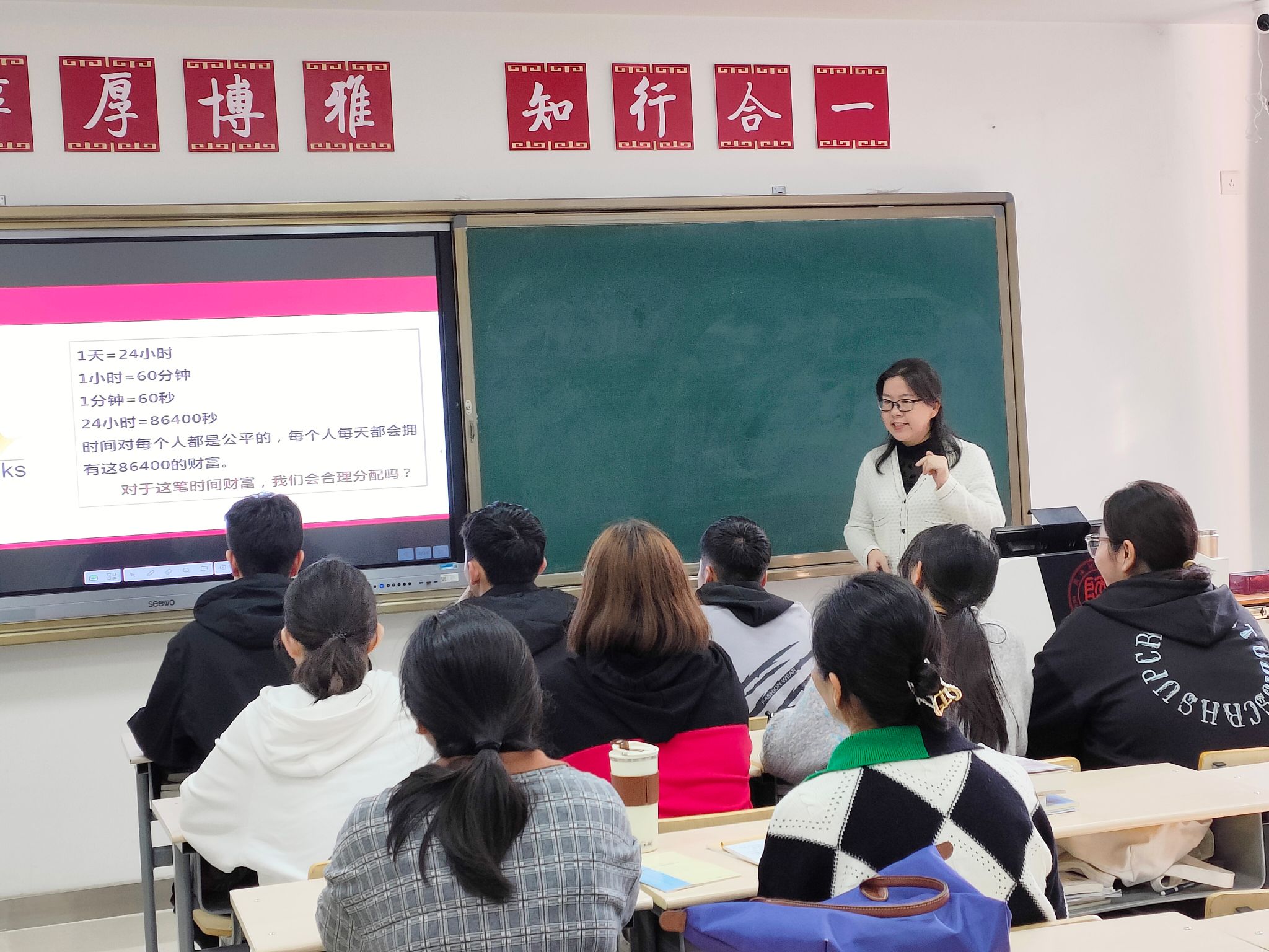 在此次教学示范课上,戴老师以《玩转“四象限法”成为时间达人——时间管理》为授课内容,展示了她的教学风采。戴老师巧妙运用猜谜的方式引入了时间银行概念,并通过撕纸条这一互动游戏带领学生感受“人的一生有多长”以及在除去吃饭、睡觉等日常琐事后,每天剩余的时间是如此短暂,引导学生珍惜人生时光。这种互动的教学方式不仅吸引了学生的注意力,更加激发了学生学习的积极性。在授课过程中,戴老师着重于时间管理四象限法进行讲解,教学内容重点突出,并结合学生日常生活进行举例,课堂讲授与启发思考相结合、教学目标与思政目标相结合,呈现出完整的课堂教学结构,课堂效果甚佳。