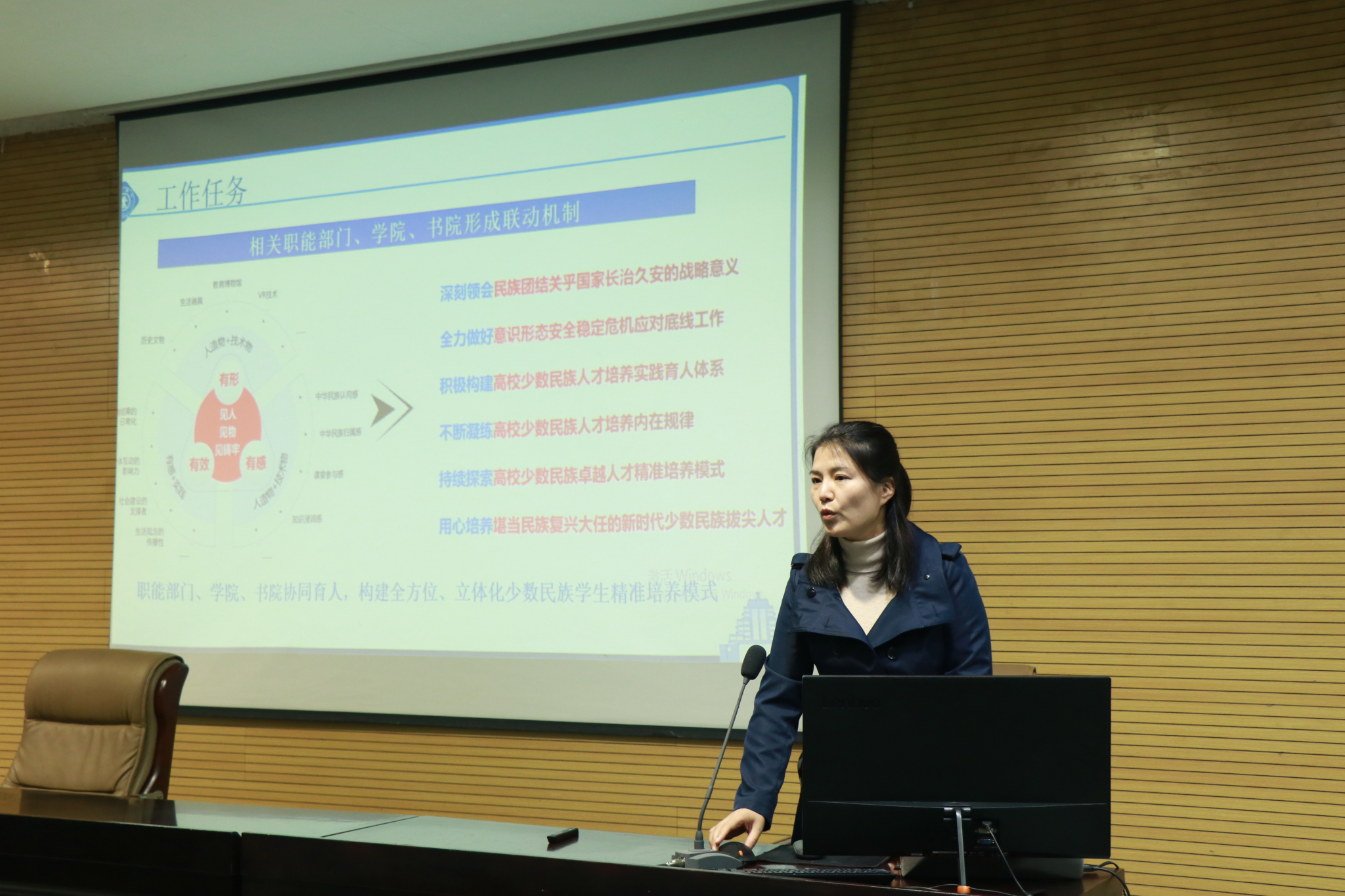 全体师生参加了本次会议,院长龙宝新教授主持会议。本次研讨会由开幕式、主旨报告与专题论坛三个环节,紧紧围绕“少数民族预科教育高质量发展”这一主题展开,通过主旨报告、专题论坛等形式就铸牢中华民族共同体意识、预科育人工作开展、民族预科教育发展等问题开展了深入学术交流。