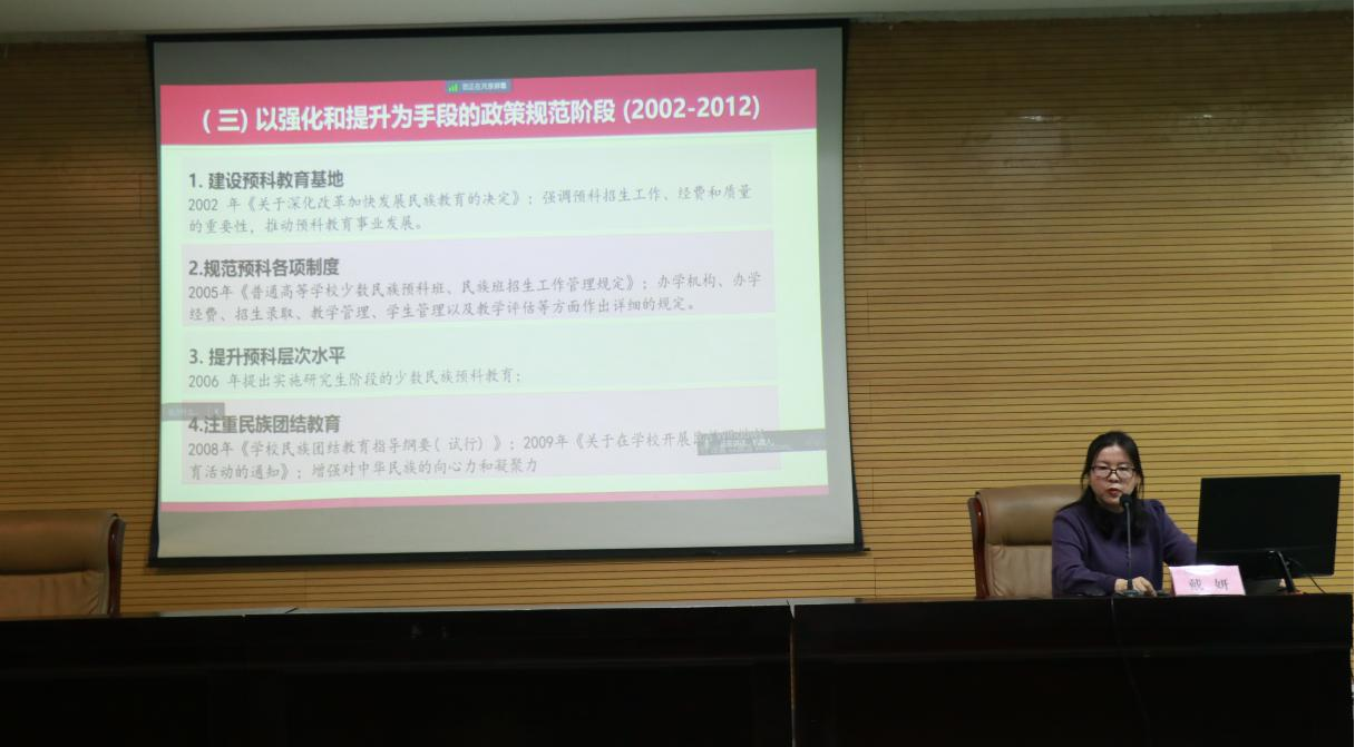 学院教师戴妍抓住国家政策脉络走向,作了《我国民族预科教育政策的发展历程、演进逻辑与未来走向》的专题报告。报告指出,高质量民族预科教育应完善以简政放权为核心的政策动力机制、追求以多元价值为旨归的政策目标取向、强化以督导评估为抓手的政策实施过程,构建多元参与为主体的预科教育政策话语体系。