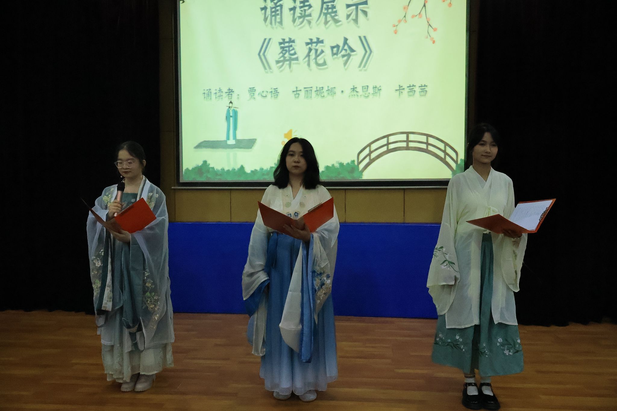 在最后的颁奖典礼上,三位同学集体诵读的《葬花吟》将大家再一次代入了那个经典永存的年代;文学院赵文老师的精彩点评认为此次大赛彰显了omofun