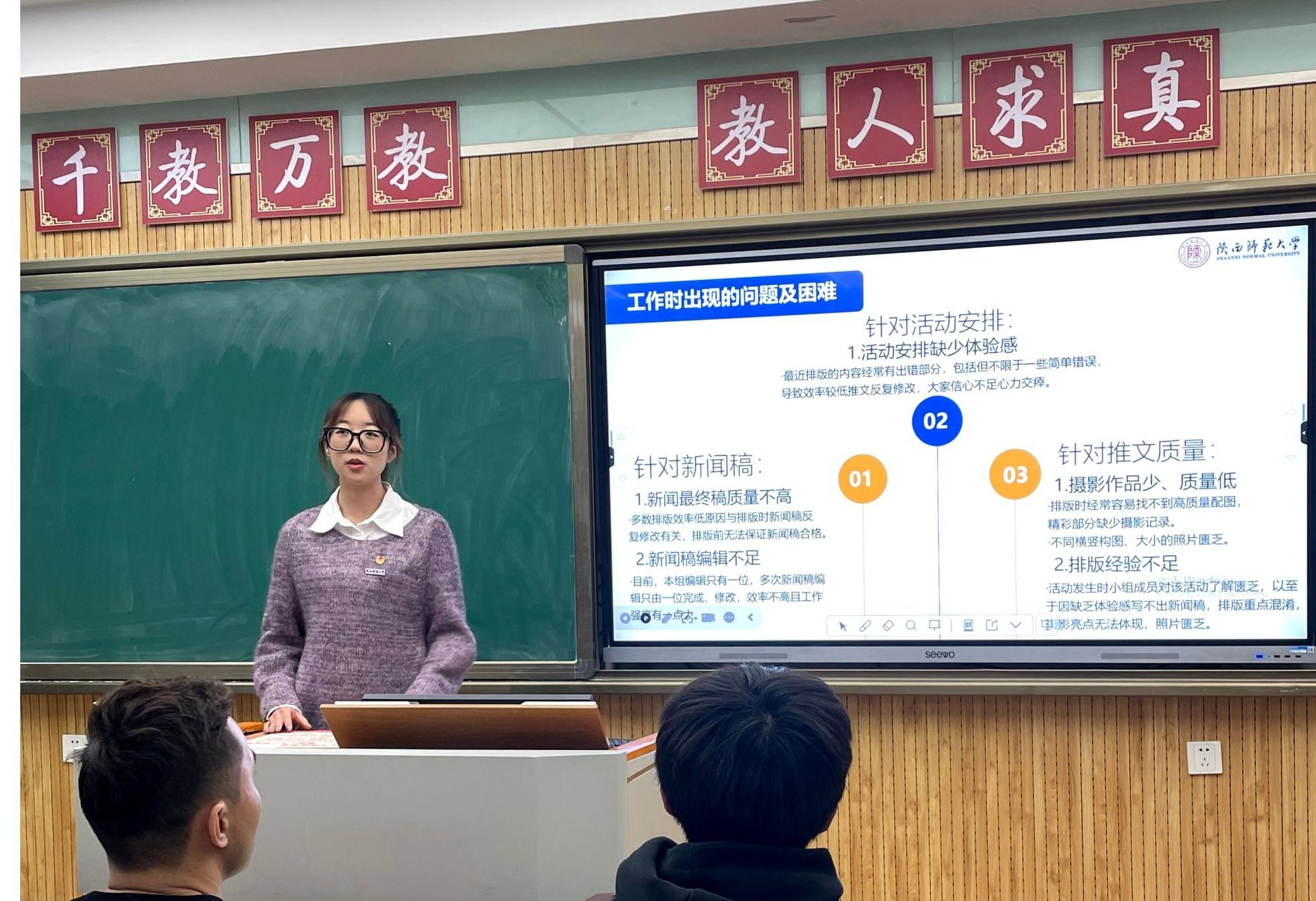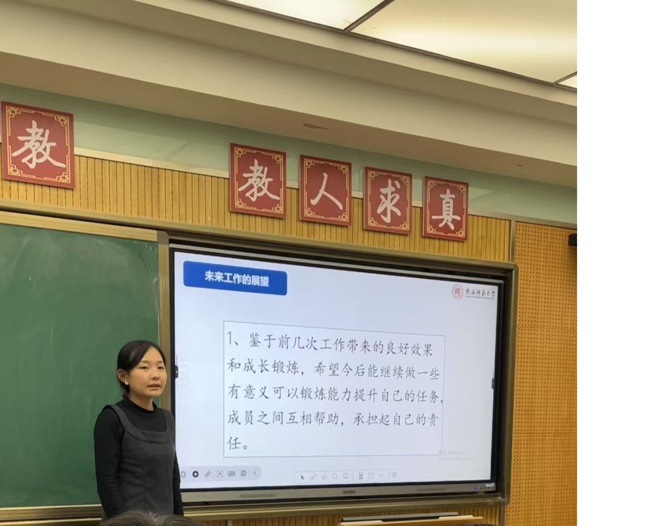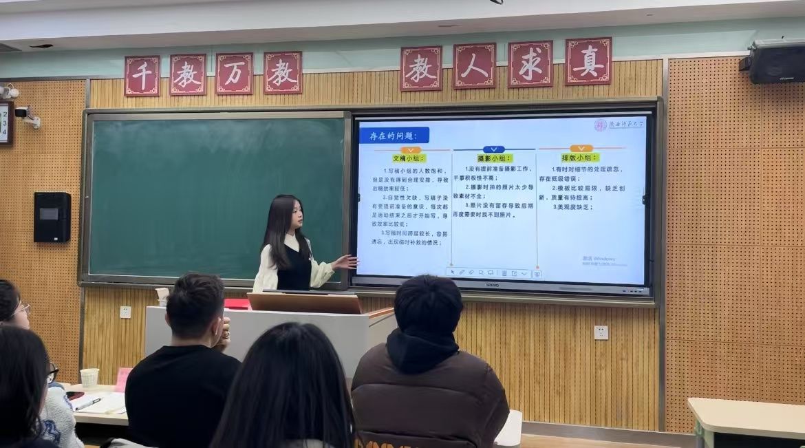 汇报结束后,刘江珊根据汇报情况,从内容完整性、着装与语态方面为汇报人提出建议,并对各部门近期工作中存在的困惑予以回应。她强调,学生干部务必摒弃“等靠要”心态,要主动寻找机遇,大胆创新工作模式:一要强化交流沟通,促进部门间及干部间积极互动与信息共享协作;二要高标准严要求,全力确保每项任务的高质量完成;三要建立问题汇报机制,确保问题能及时向上反馈并迅速解决;四要注重收获与反思,在任务完成后认真总结经验,切实将反思成果转化为改进举措并有效落实到后续工作中,持续提升个人能力与团队整体水平。
