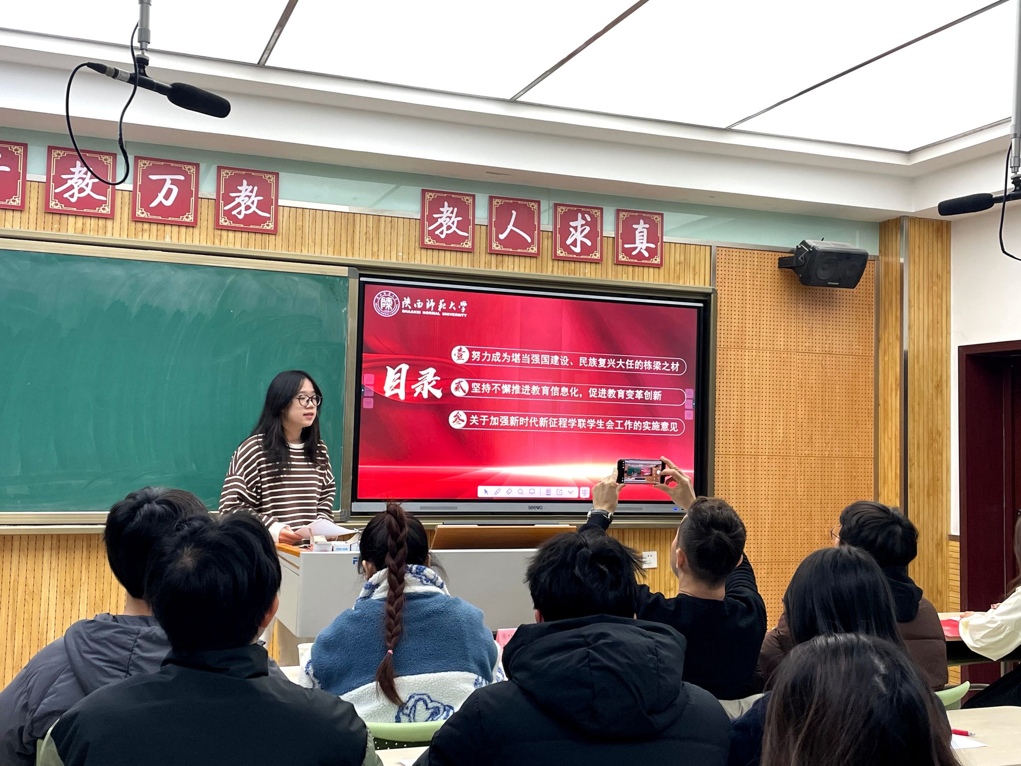 会议伊始,学生会主席团成员覃佳带领大家学习了习近平总书记关于青年工作的重要论述。她分别从习近平总书记对青年的回信期望、教育变革创新推动举措以及学联学生会工作指导意见三项内容展开解读分析,激励各族青年加强理论学习,将个人的前途和国家的命运结合起来,在实践中锤炼本领、提升素质,引领各族青年坚定不移感党恩、听党话、跟党走,立志做有理想、敢担当、能吃苦、肯奋斗的时代新人。