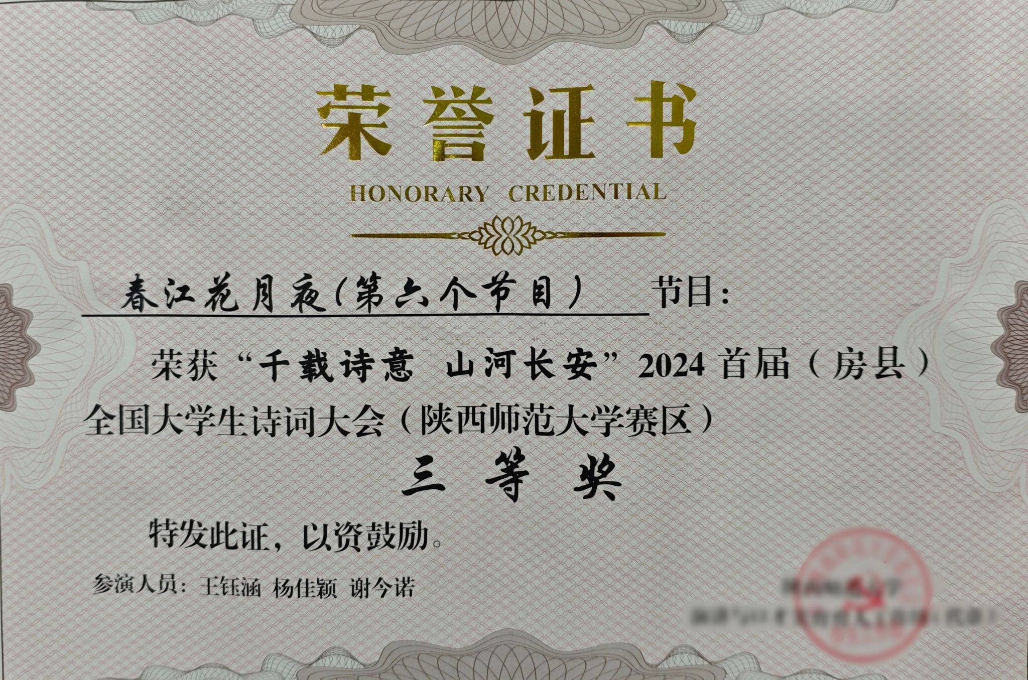 在2024首届(房县)全国大学生诗词大会中,学院预科1班王钰涵、杨佳颖、谢今诺团队朗诵作品《春江花月夜》荣获三等奖。