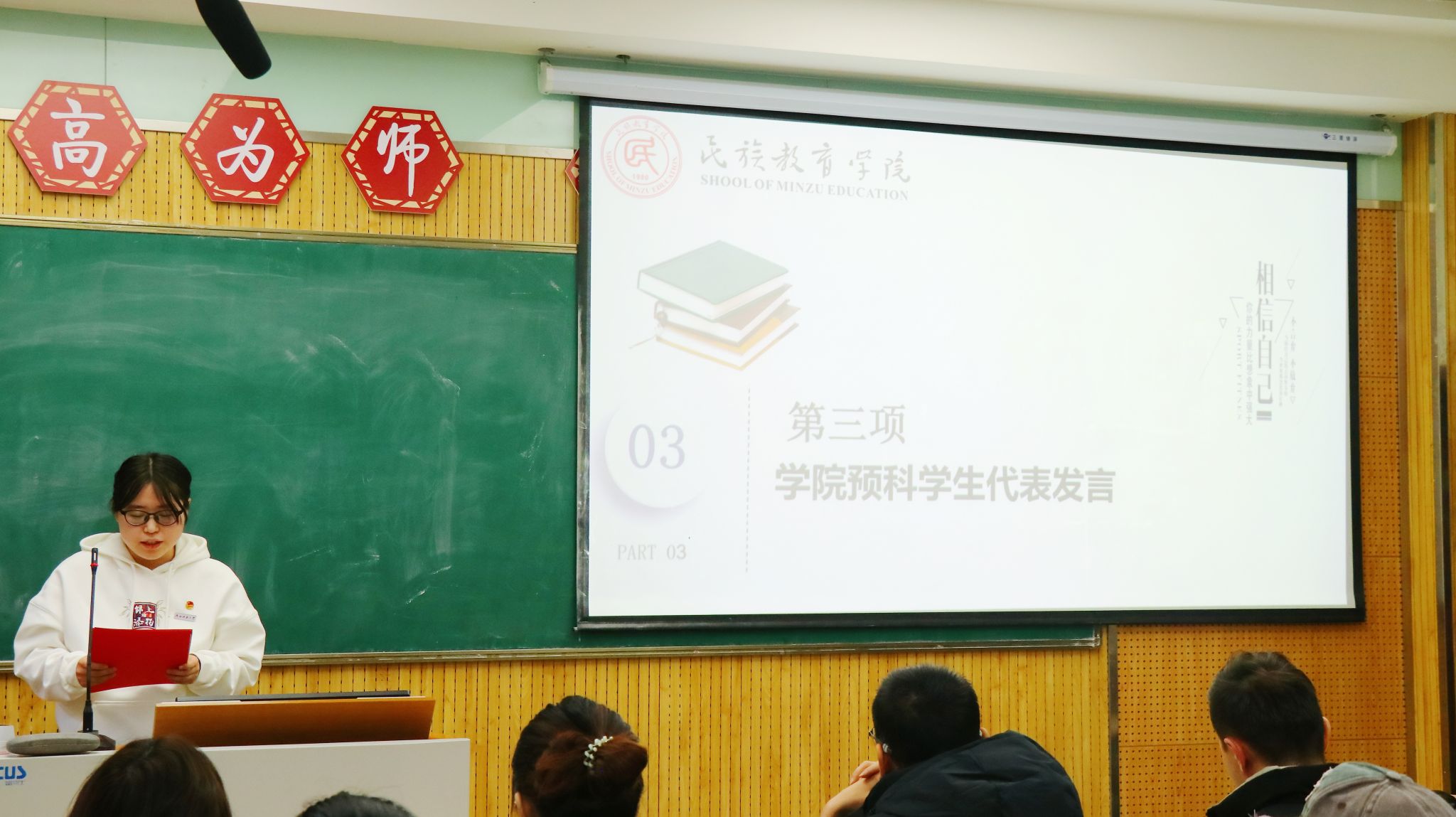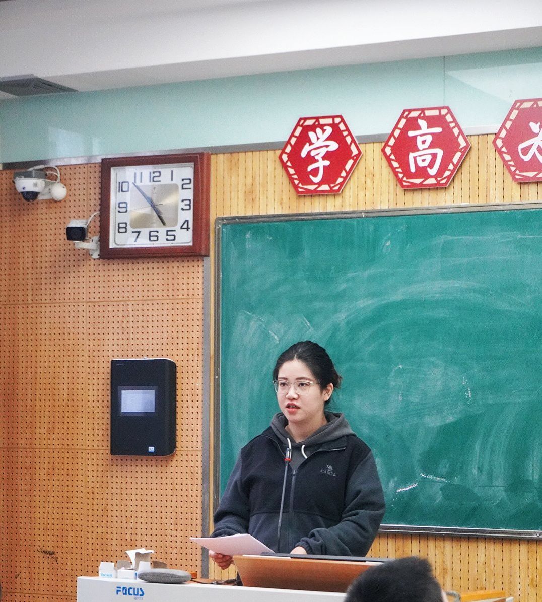 接着,学生代表预科2班冯翔瑾发言,她结合自身学习经验,分别从树立学习信心、正确评价自己、调整考试动机、控制和调整考前情绪、制定复习策略等五个方面,就期末考试复习中的常见问题提出解决思路和建议,并呼吁诚实做人,文明考试。