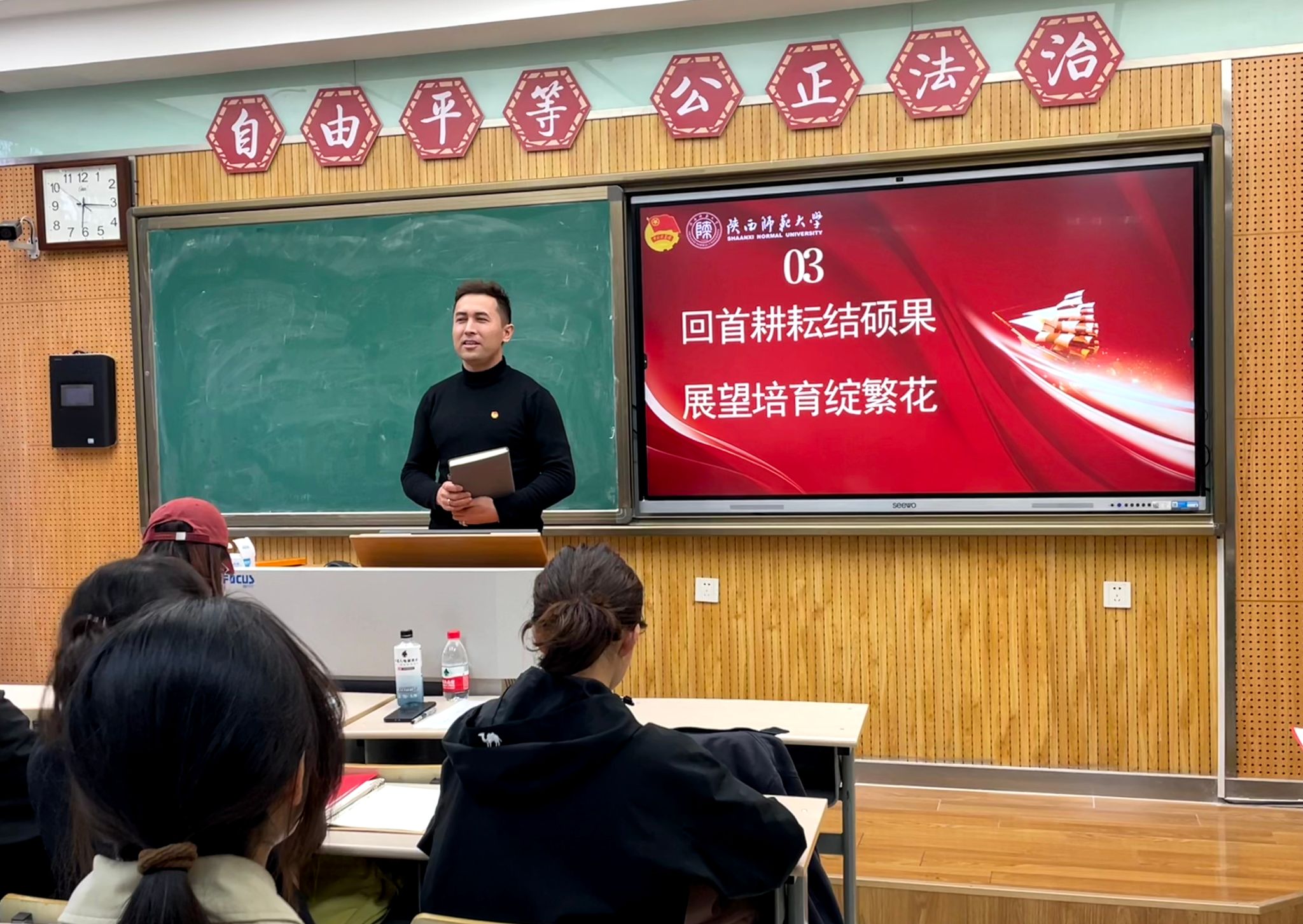 最后,热依木・努尔麦麦提对大会进行总结发言。首先,他感谢所有学生干部对学院工作的大力支持和辛勤奉献。其次,他从学生工作在促进师生交往交流交融、推动民族团结融合以及助力学生全面发展进程中所扮演的重要角色和发挥的关键作用方面做了详细阐述,强调学生干部谋划工作时要着眼于同学们的终身发展,促进同学们身心健康,激发同学们的发展潜力。他提出了三点期望:一是强化思想引领,积极开展铸牢中华民族共同体意识系列教育活动,筑牢学生思想根基,提升思政育人实效;二是始终围绕学院发展重点工作,精心组织类型多样、内容丰富的实践活动,服务同学成长成才,在实践中锻炼自己,提升综合能力;三是坚守“全心全意为同学服务”宗旨,强化责任担当意识,发挥模范带头作用,切实解决同学们学习生活中的难题,以实际行动为学院发展与同学成长贡献力量。