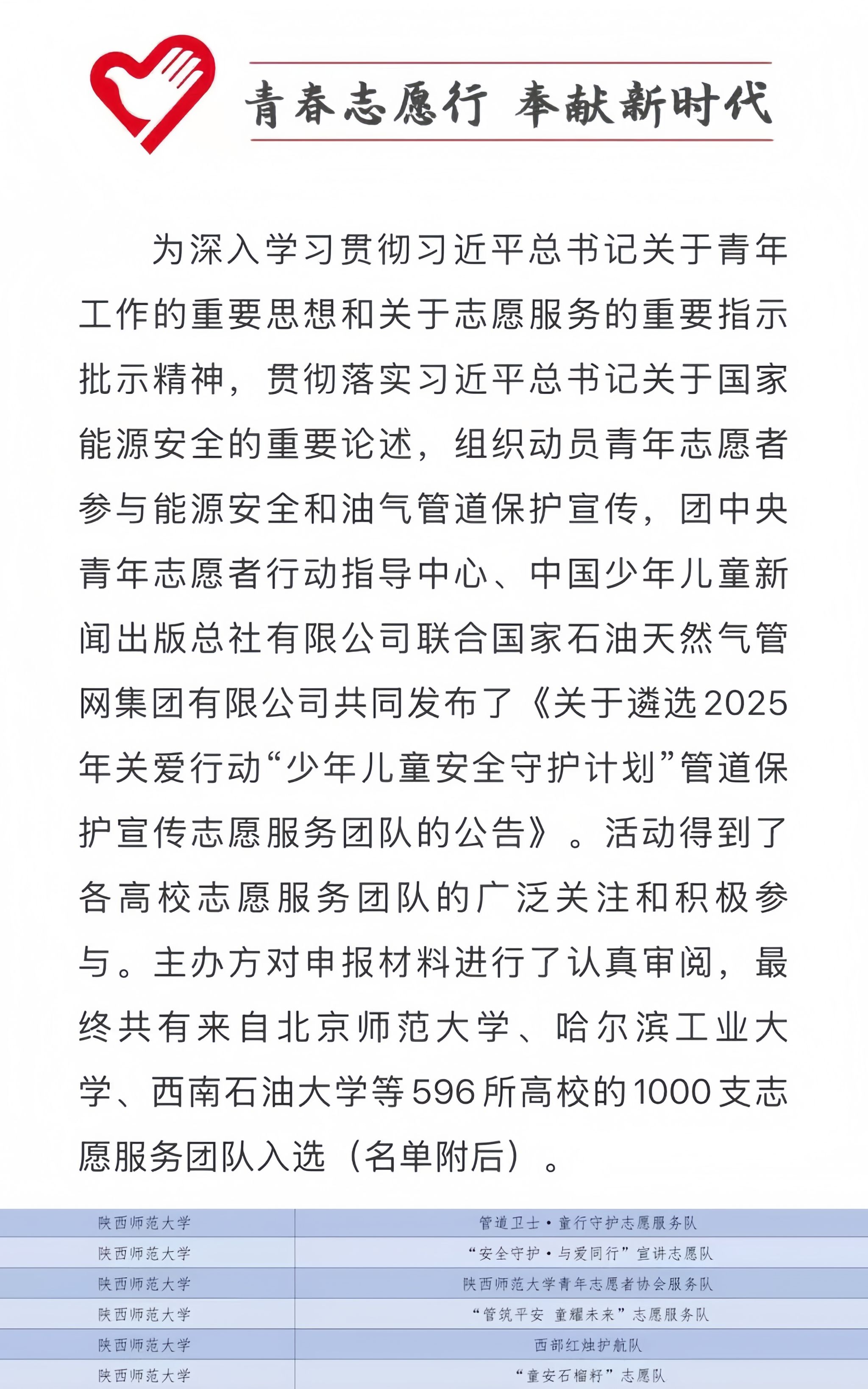 由团中央青年志愿者行动指导中心、中国少年儿童新闻出版总社有限公司与国家石油天然气管网集团有限公司联合开展的2025年关爱行动“少年儿童安全守护计划”管道保护宣传志愿服务团队遴选结果正式公布。